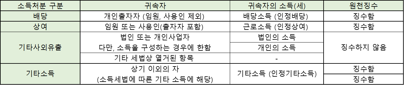 위에서 언급한 사외유출 항목 4가지에 대한 특징을 간단한 표로 알아보도록 하겠습니다