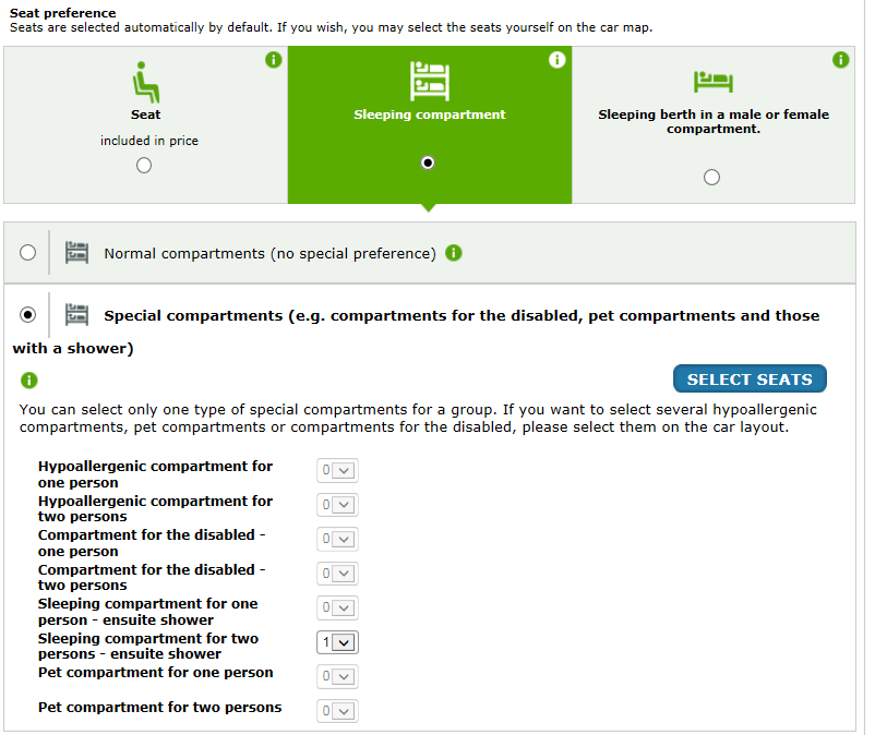 날짜와 시간을 선택한 후 위에 보이시는 파란 박스 좌석 선택 버튼을 누르면 침대 칸 등 옵션 등을