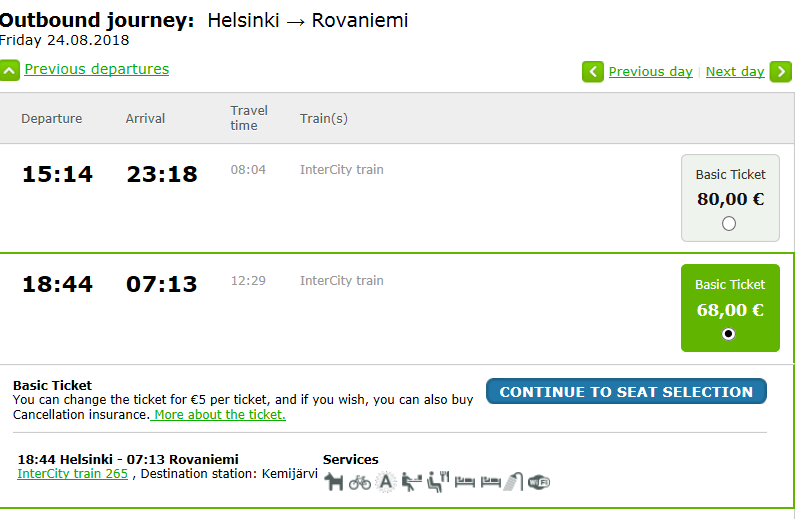 아래는 헬싱키에서 로바니에미까지 임의 날짜로 선택한 화면입니다