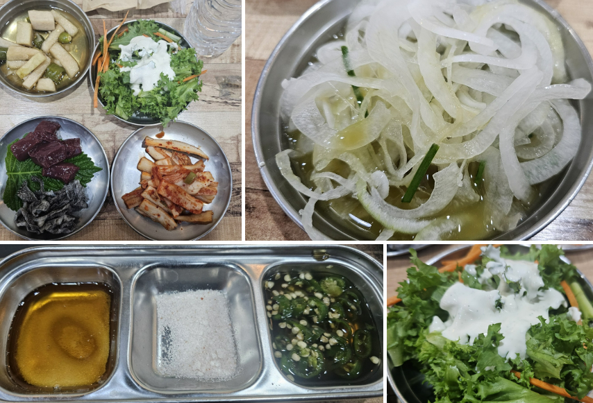기본 상차림은 양파절임 양념 3가지 (소금. 기름장. 양념간장)