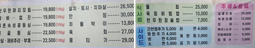 육회 뭉티기 간 천엽이 서비스로 기본 제공됩니다