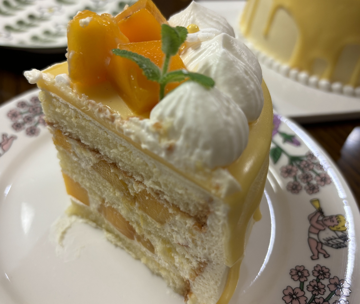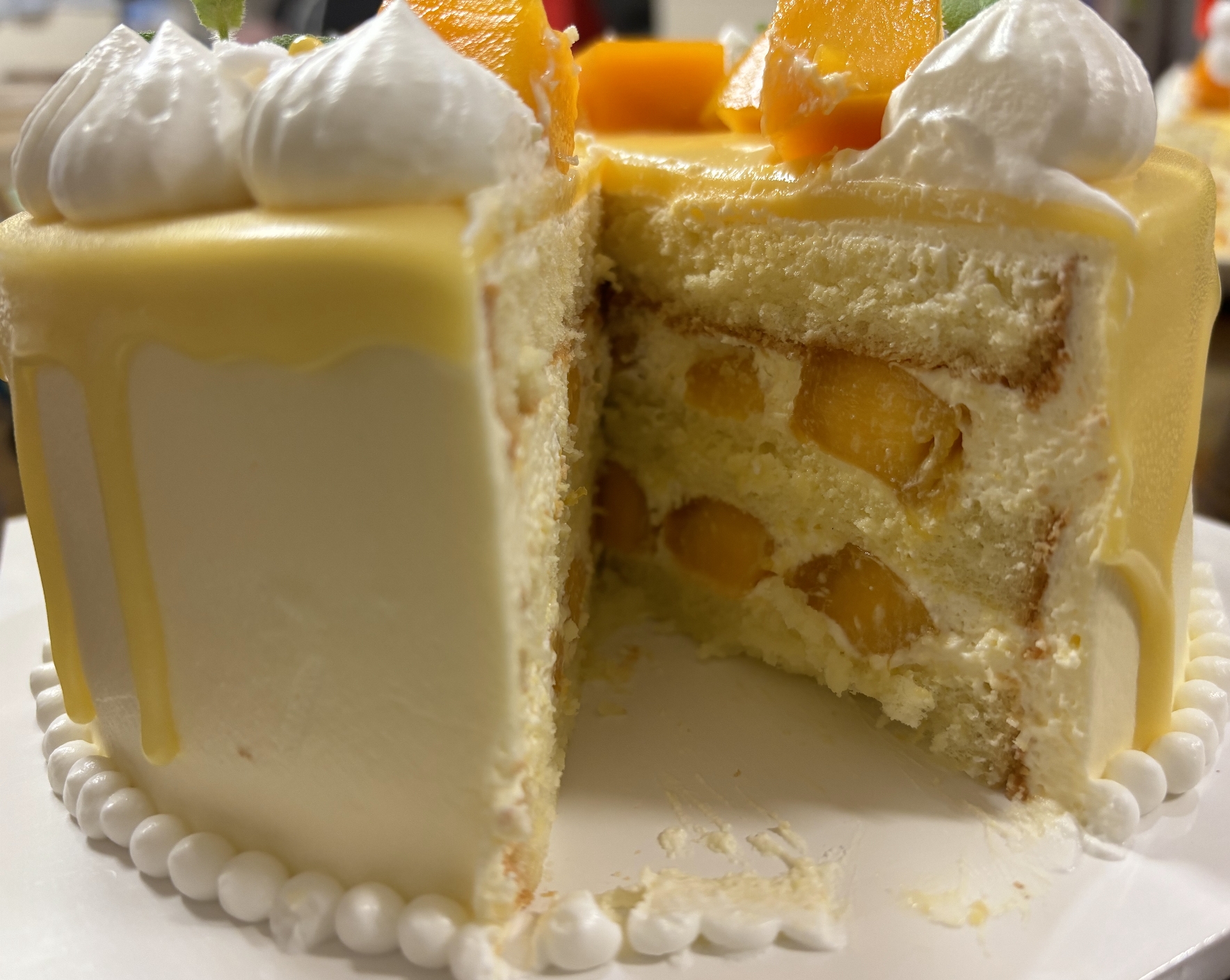 신선하고 두툼한 망고가 올라가 있는 망고케익