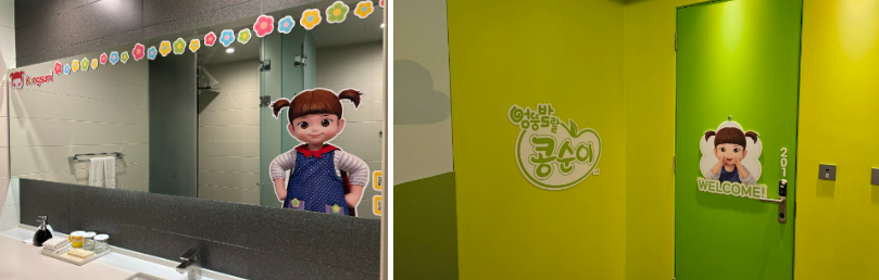 벽에 콩순이와 친구들 그림이 그려져 있는데