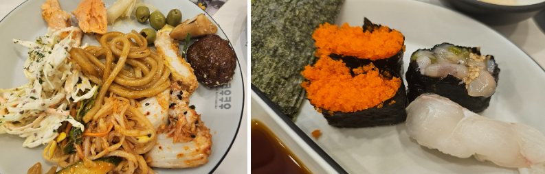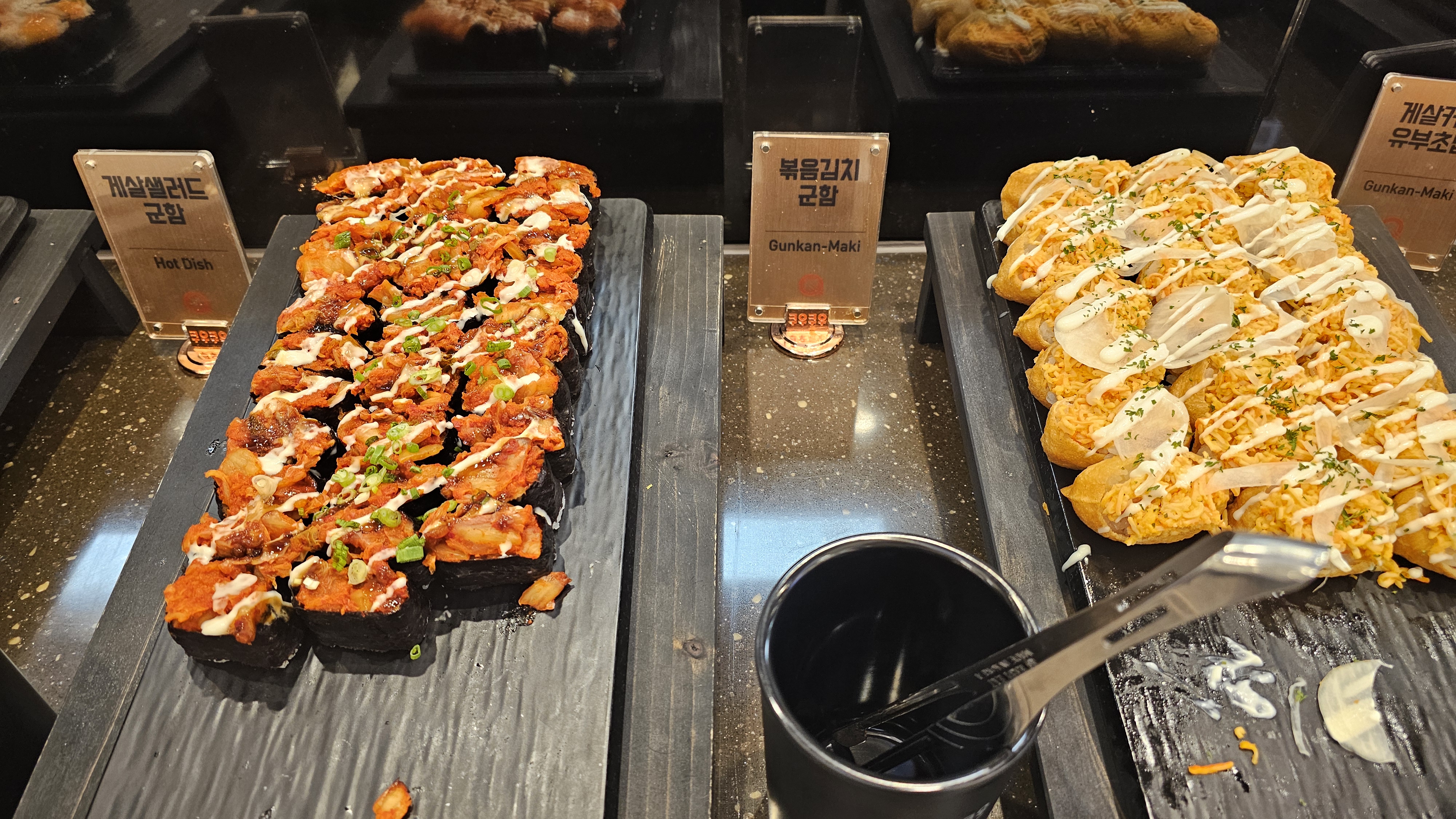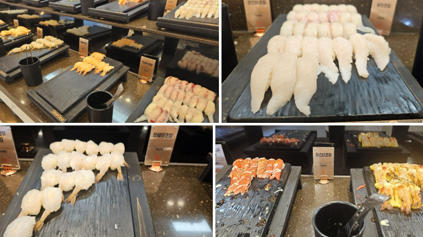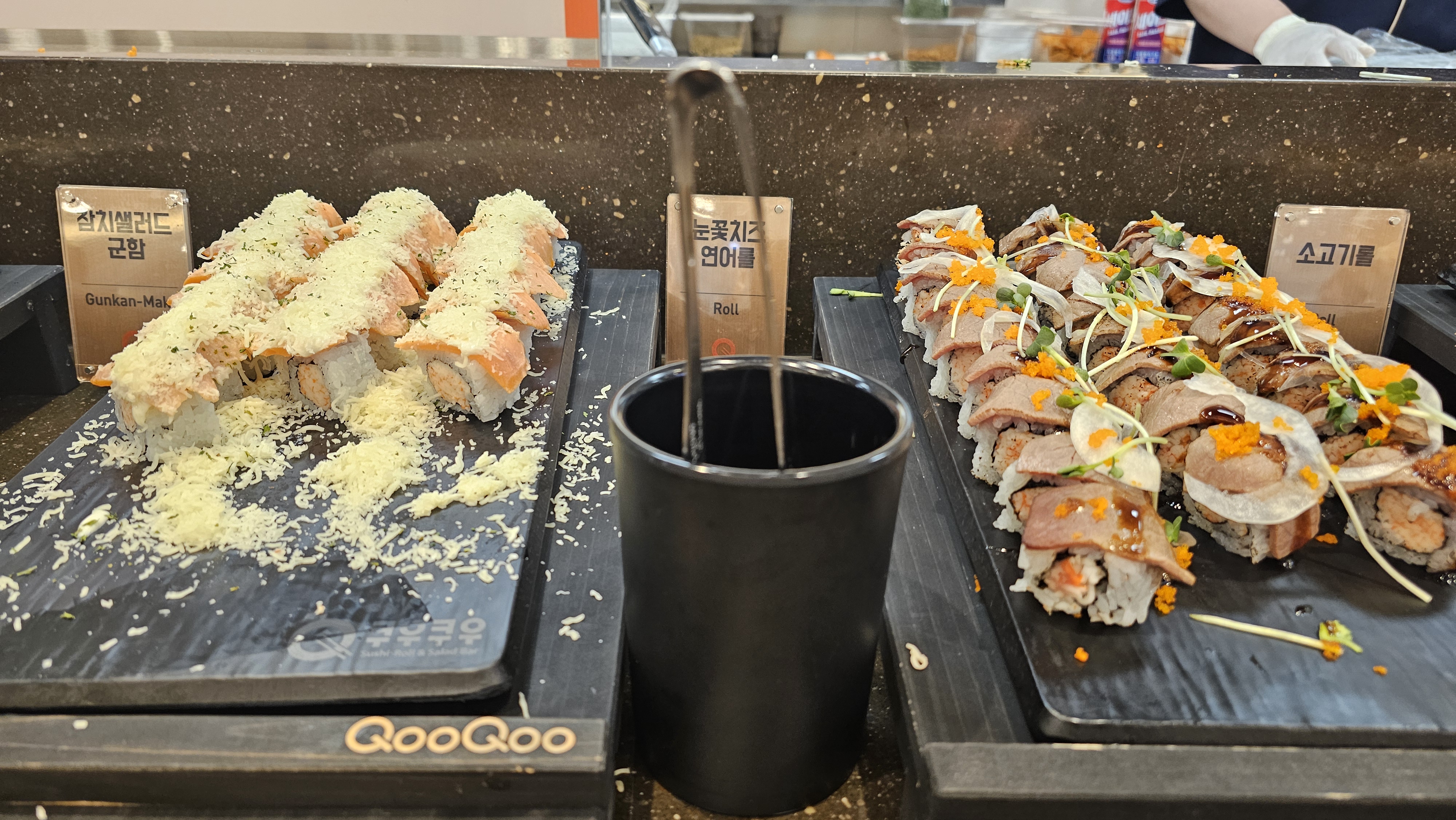아래는 초밥 뷔페인 쿠우쿠우의 초밥과 다양한 롤입니다