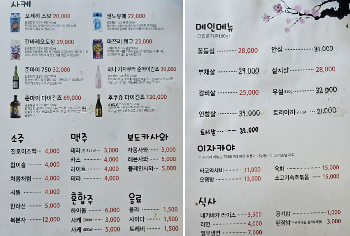 수희마을 24년 7월 중순 방문했을 때 기준 메뉴판입니다
