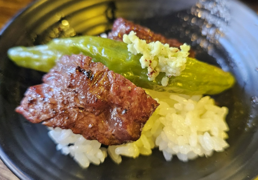 은은하게 구운 꽈리고추에 고추냉이를 살치살에 올려서