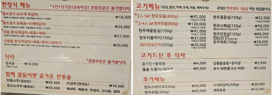 황소고집은 한정식과 한우가 주요 메뉴입니다