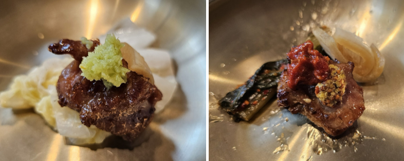 잘 익은 돼지갈비에 고추냉이와 갈치속젓을 올려서 드시면 짜릿한 맛을 느낄 수 있습니다
