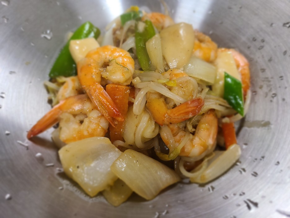 3. 야채의 숨이 어느 정도 죽으면 새우를 넣고 볶아 줍니다.