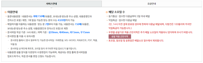 또한 아래와 같이 서비스와 요금이 상세히 안내되어 있습니다 (출처 : 우체국)