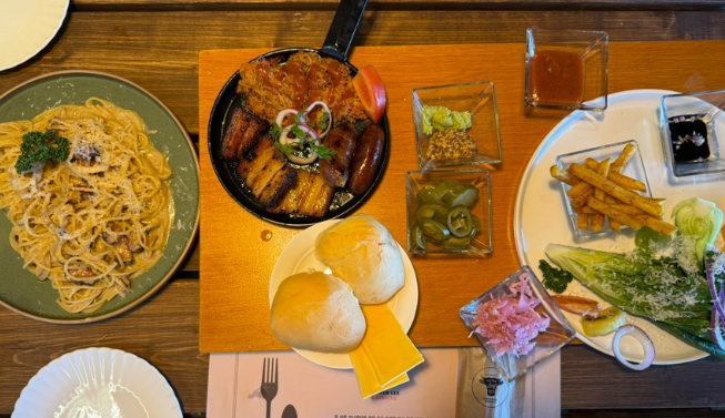 파스타 + 바비큐(풀드 포크/소시지/베이컨) + 샐러드 + 미니 번 + 음료 2잔