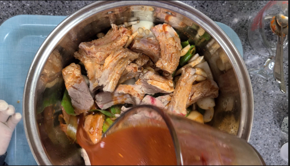 6. 준비한 야채를 냄비 아래에 깔고 한번 삶은 등갈비를 그위에 올리고 양념을 붓고 30분이상 끓여주시면 됩니다