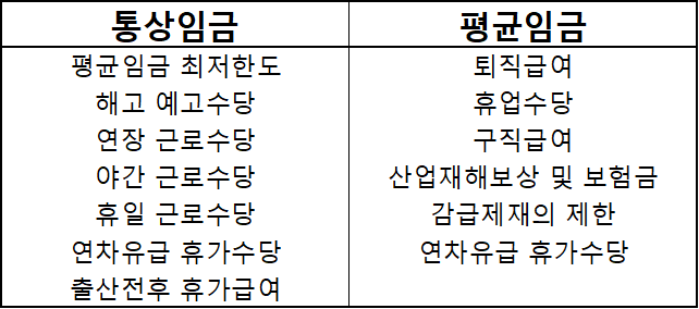 마지막으로 통상임금과 평귬임금의 해당하는 수당의 종류 (상황)을 아래 표로 간단히 정리해 보도록 하겠습니다