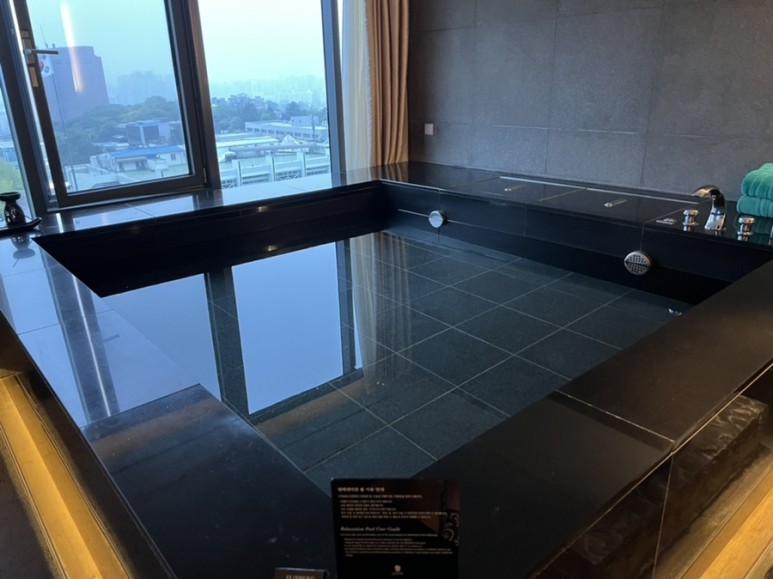 1-4살 아이들이 돌기 딱 좋은 크기와 깊이입니다. 성인 무릎 정도 깊이라 보시면 됩니다 예약 시 매일 물을 새로 받는다고 했는데 정말 매일 물을 새로 받아서 깨끗하고 부유물도 없고 좋았습니다 기본 온도는 36 ~ 37도 사이인데 투숙객이 찬물과 뜨거운 물을 틀어서 온도 조절도 가능합니다