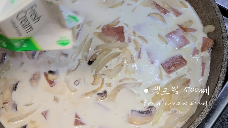 펜에 생크림 500ml를 넣고 1분 정도 저으면서 약한 불에서 끓여 줍니다
