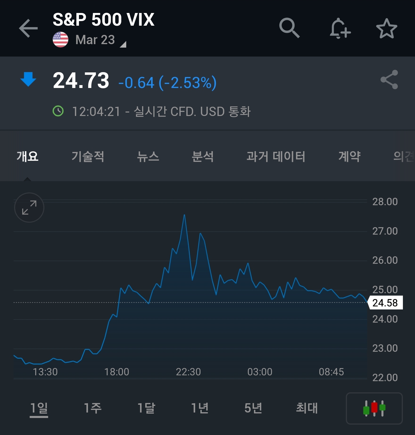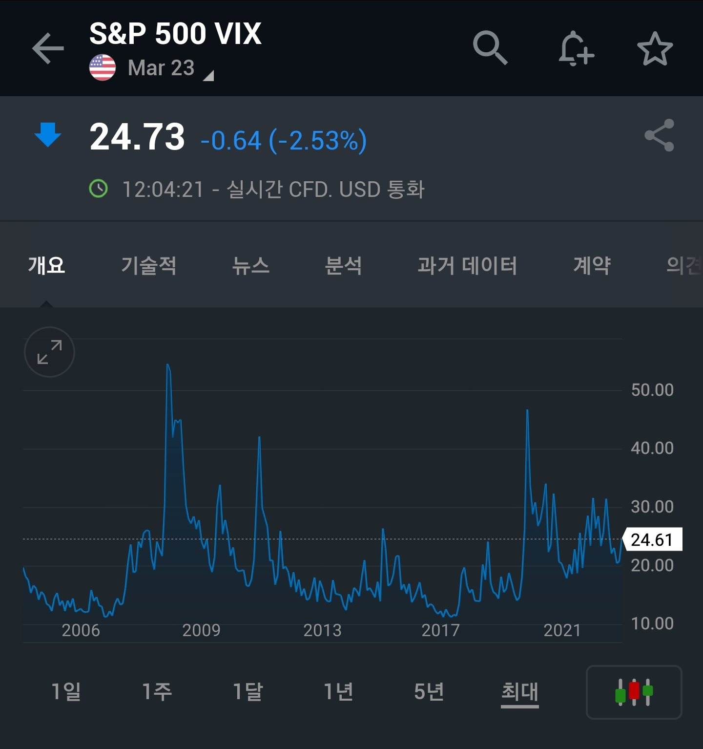 아래 사진은 23년도 3월 기준 VIX 지수 모습입니다